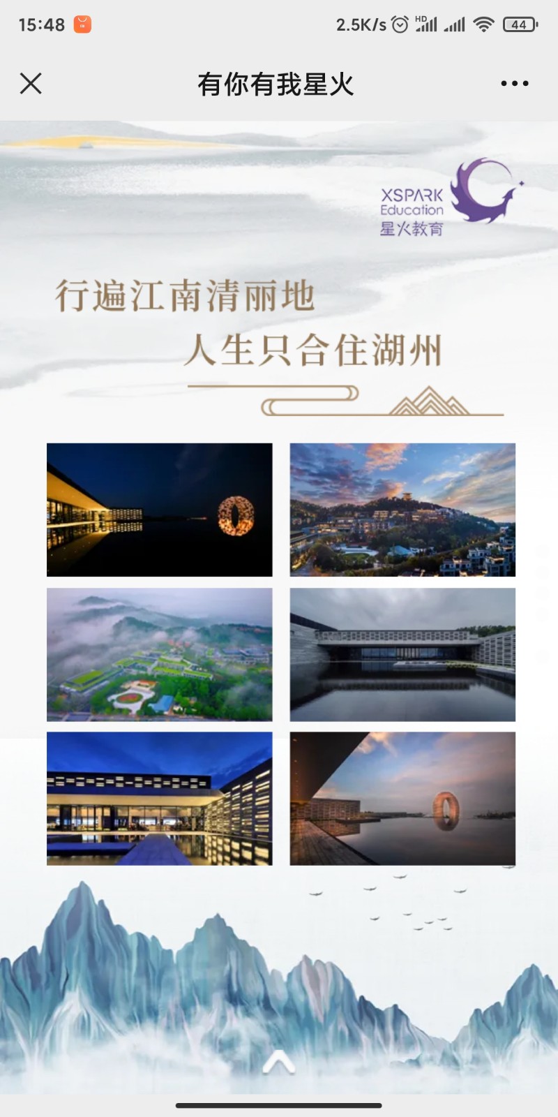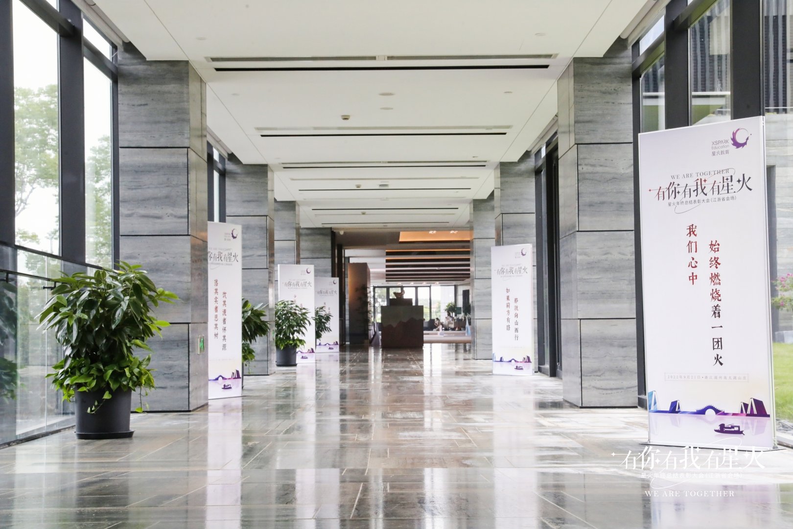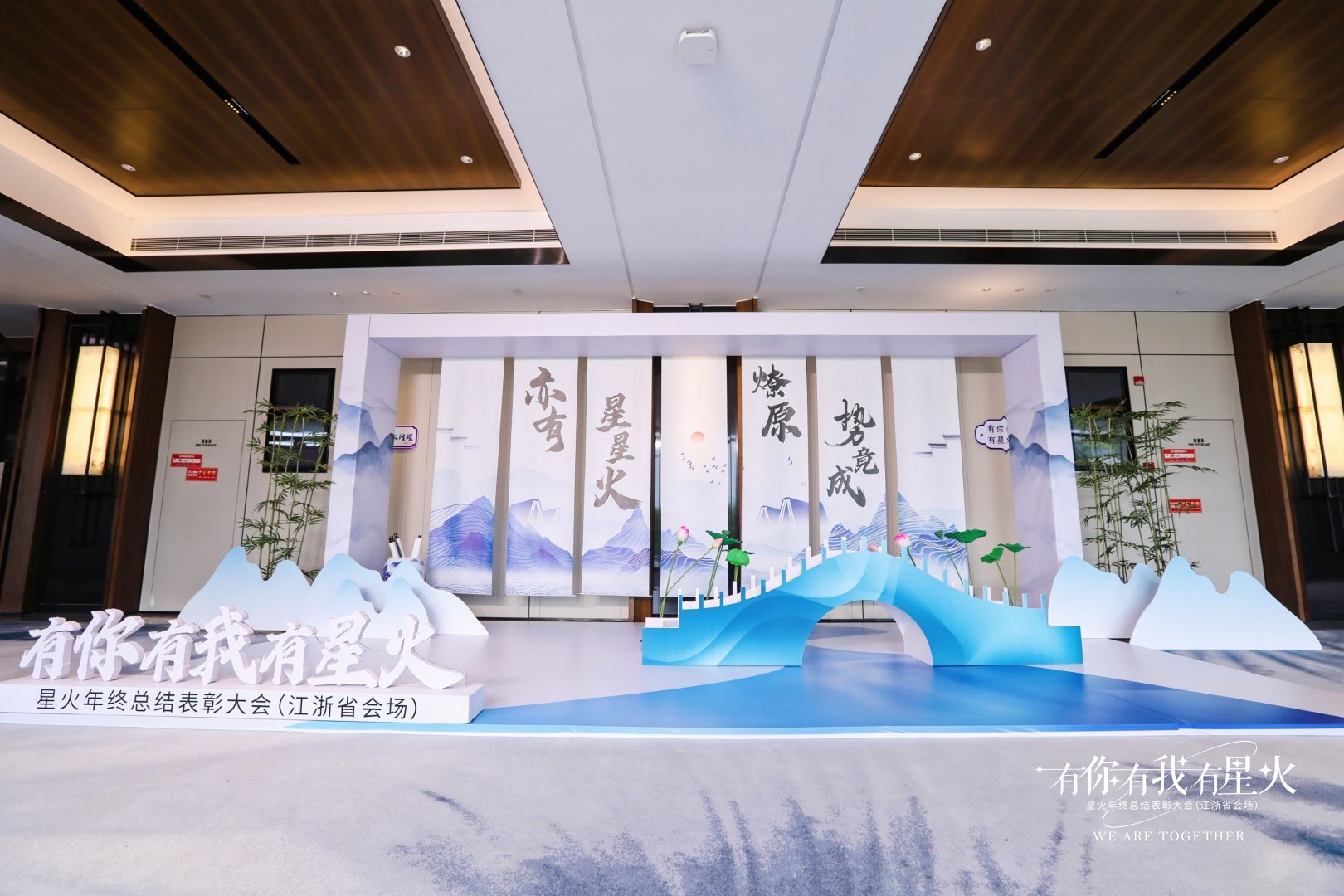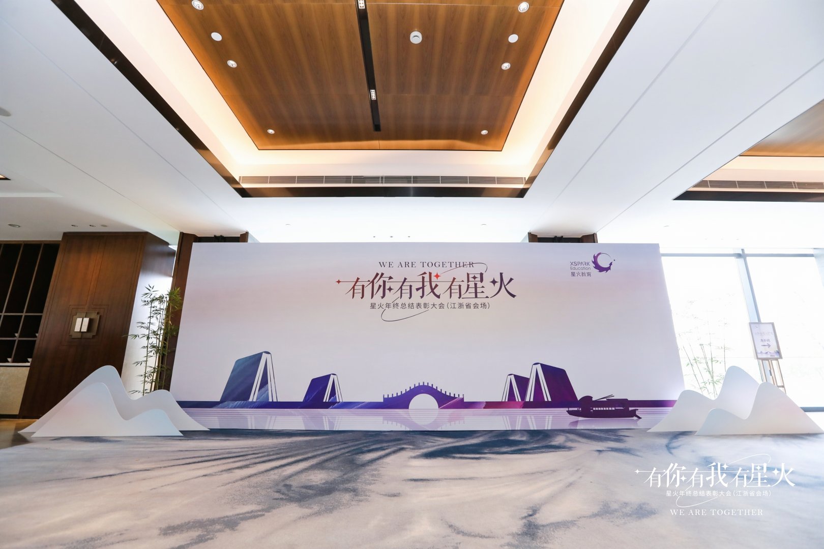 整體顏色以藍紫色為主,融入湖州“水鄉(xiāng)行船”的特點,主中心是一座寓意連江南文化與星火教育連接一起的橋梁,也寓意每位星火人都是嫁接成長教育的橋梁。