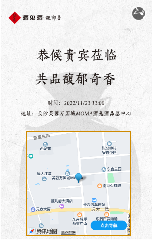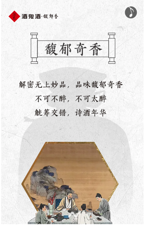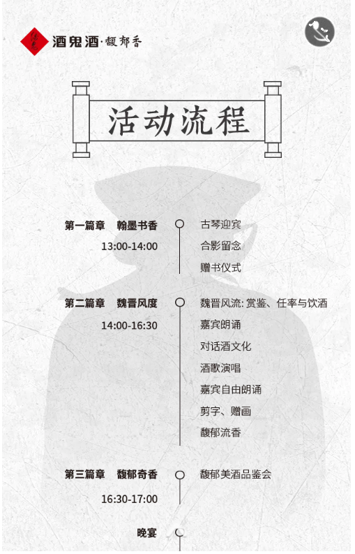 以主畫面延展邀請函,灰白色調(diào)的背景凸顯出酒鬼酒瓶形狀,以古畫人物場景詮釋活動內(nèi)容,富有古雅的色彩和情調(diào),彰顯品牌的文化韻味。