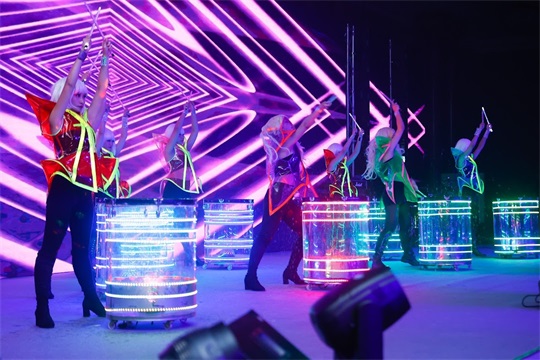 內(nèi)場舞臺燈光與暗場的氛圍輝映下,時尚感、潮流感包裹全場,讓觀眾沉浸在慶典的歡樂氛圍當(dāng)中。
