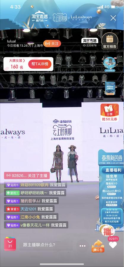 在半小內(nèi),露露這個(gè)品牌就達(dá)到了70多萬的觀看聲浪海時(shí)裝周聯(lián)手天貓打造的“云上時(shí)裝周”開幕秀正式開啟。天貓數(shù)據(jù)顯示,3天的云上直播,共計(jì)有150萬人次涌入淘寶觀看直播,創(chuàng)造了時(shí)裝周歷史上之最。特別值得一提的是,在開播30分鐘內(nèi),露露這個(gè)品牌就超過了70多萬的觀看聲浪。
