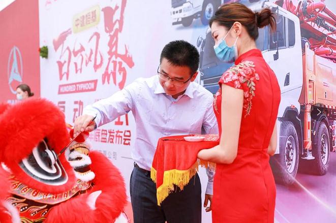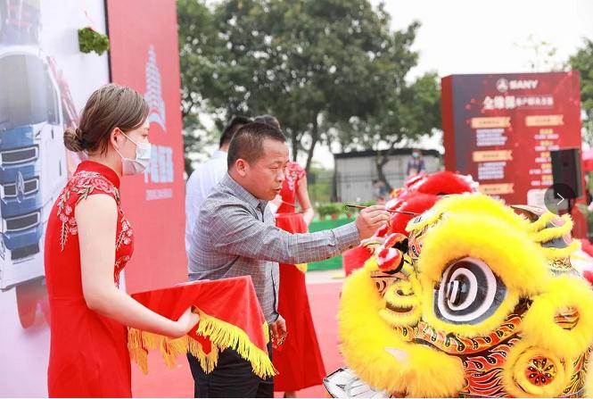 產(chǎn)品推介后,三一重工泵送營(yíng)銷(xiāo)公司總經(jīng)理李梁健、廣東中建恒基執(zhí)行董事王甫上臺(tái)進(jìn)行舞獅點(diǎn)睛儀式。
