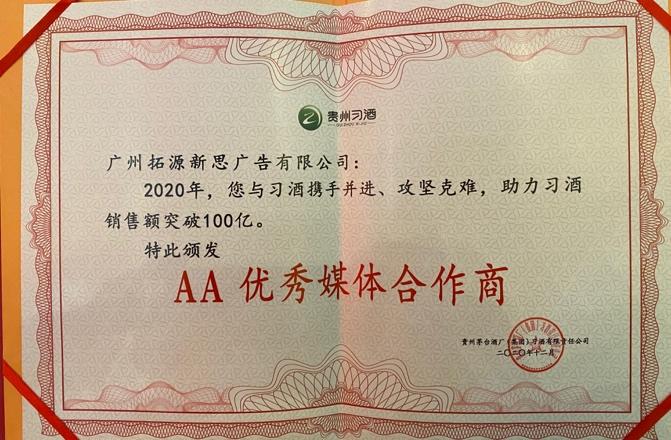 廣州拓源新思榮獲茅臺(tái)集團(tuán)習(xí)酒公司2020年度“AA級(jí)優(yōu)秀媒體合作商”獎(jiǎng)項(xiàng)