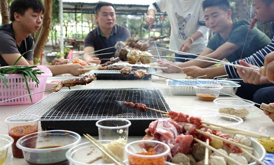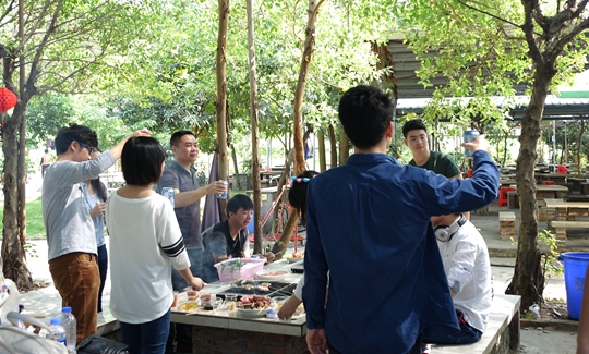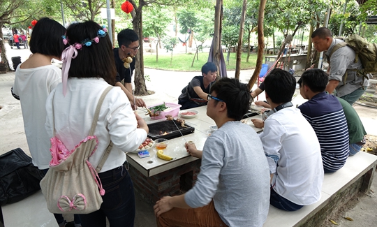 自助燒烤的午餐可是吃貨的最愛,男生紛紛大顯廚藝身手,為身邊的女生烤上最鮮美的燒烤,以表殷勤。連平常不下廚的設(shè)計總監(jiān)sky今天也小秀廚藝,美女此時也不拘謹,在鏡頭前品嘗最鮮香的烤肉這都是滿臉的幸福感啊!