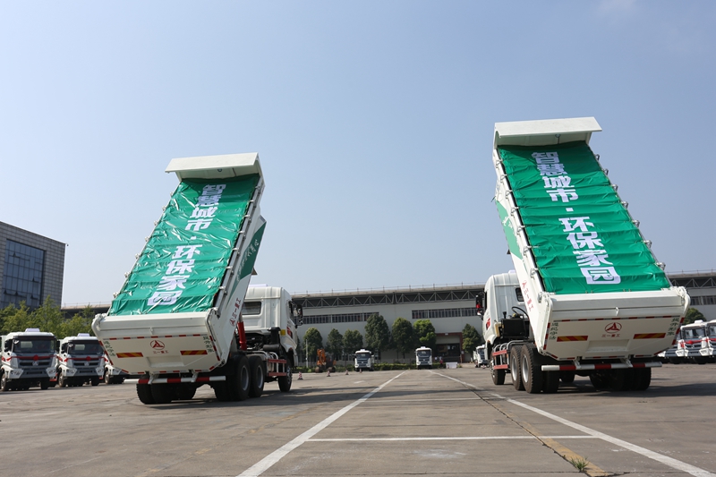 伴著響亮的鳴笛聲和禮花聲,31臺(tái)三一環(huán)保智能自卸車威武發(fā)車,浩浩蕩蕩地開往客戶工地,完成“環(huán)保俠”建設(shè)美好城市的綠色使命?!?/p>