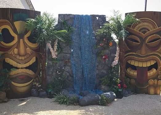 巨大的提基神像臉譜搭建了一個墻面來幫助隔斷戶外場地的某些區(qū)域,讓你可以引導客人走向正確的方向,而不偏離主題。這個私人主題派對的墻面背景,也是一個令人印象深刻的活動照片墻。(充分利用好活動現(xiàn)場的隔斷墻面)