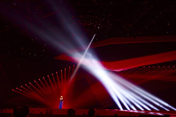 在演出中大量使用光束燈作為特效燈具的方式,在2011年歐洲歌唱大賽已經(jīng)成功運用。而2012年的表現(xiàn)則更上一層樓,此次舞臺上使用的影像占用的空間更大了,為了配合這種被壓縮了的舞臺空間,光束燈被安插在LED大屏幕的邊界處。演出近1/3的電腦燈是光束類燈具,這要求燈光與視頻裝置密切配合才能避免燈位被大屏遮擋。共3 000臺燈具被壓縮在這么小的區(qū)域內(nèi),不論是控制還是燈位安裝都相當棘手,但燈光和視頻同樣精彩才能確保40多個國家的選手上臺各自具備鮮明的特色和獨特的燈光變化。而舞美除了個別的場景外,基本沒有什么變化,于是必須依托視頻和燈光來區(qū)分每個歌手的風(fēng)格。據(jù)說,控制編程共有4 000多個CUE(絕大部分都是光束變化的程序)和近百個預(yù)置。在7個小時的超長演出中,這些設(shè)計的變化相當豐富。。其實,3 000臺燈具能被電視畫面經(jīng)常捕捉到的只是布光中很少的一部分。從燈位圖中看,舞臺的上空只有不到1 000臺燈。在現(xiàn)場照片中看到的主要為Beam燈和Sharpy燈具,正中的3個可動同心圓環(huán)上也布置了大量的Beam燈具。如圖2顯示了帶顏色的Sharpy燈具和白光1 500 W Beam的撞色搭配效果,歌手的逆光也由1 500 W Beam完成(此時斷開電機,工作人員采用手柄控制的1臺1 500 W Beam燈具完成)。