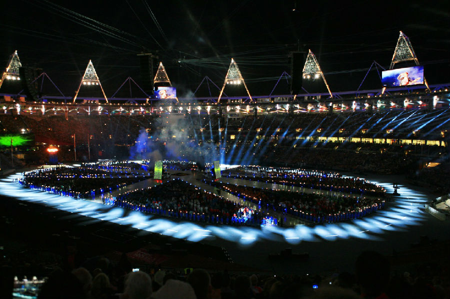 圖6 倫敦奧運會閉幕式現(xiàn)場圖(sharpy燈具的光束從二層觀眾席后區(qū)投射到運動場跑道上,跨越了約60m的距離)